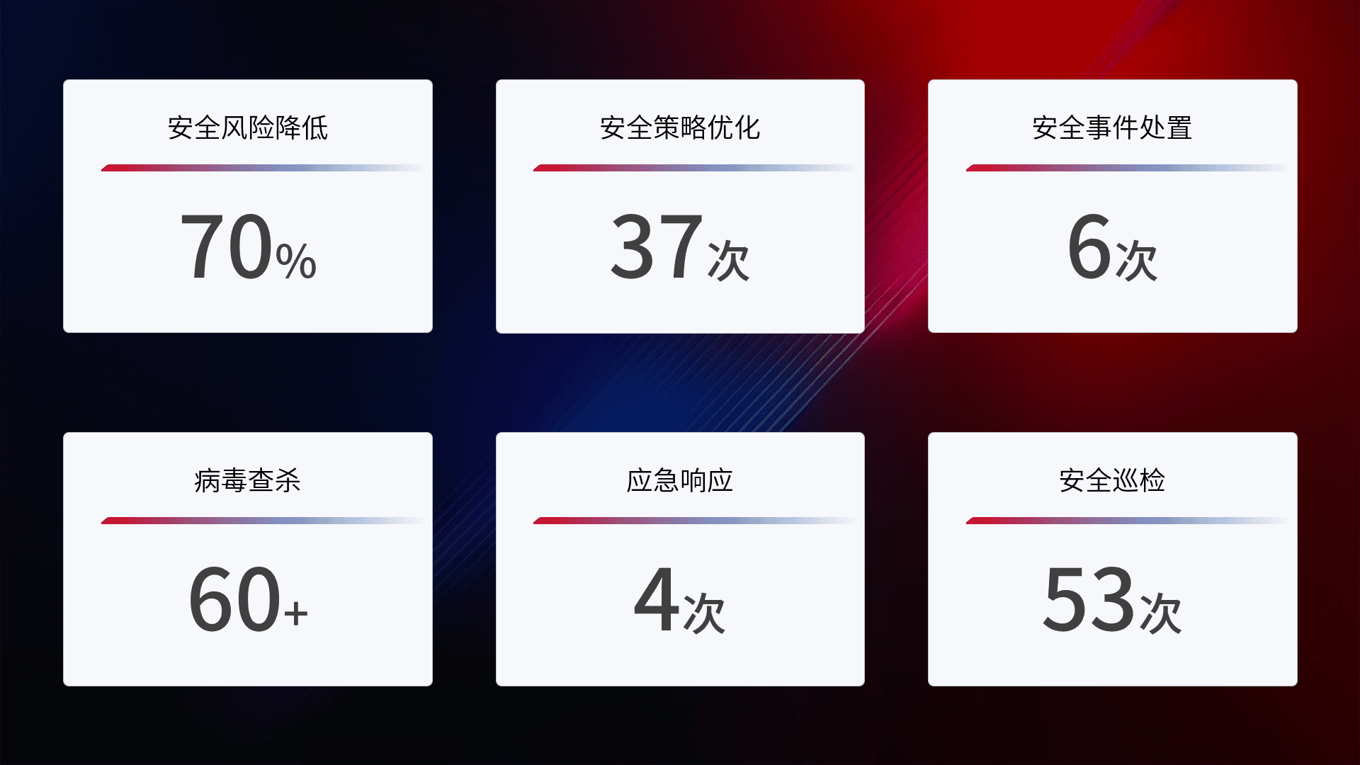 提供全面的安全事件报告体系,,,,包括处置报告、、、周报、、、季度和年度总结,,结合持续监控,,,,帮助客户深入了解网络安全状况。。。。